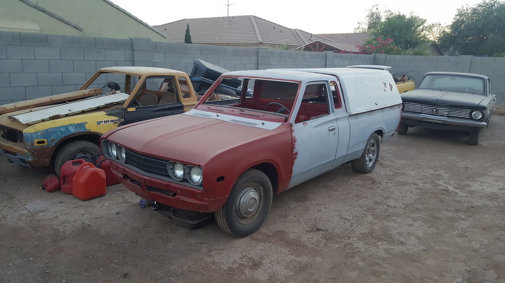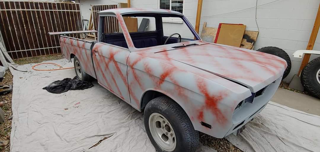so the painter got with me today and the center of roof on shell is sagging due to age and being out in the sun prior to me getting it the 1st time, when i found it the shell was sitting on a mazda truck in a junkyard here in hell/phoenix so initial thought was that we would brace it up from the inside but it is double layered fiberglass and inside is fine, its the outside that is damaged and it is really textured by whoever decided to paint it with white house paint and it was originally red, but whoever painted it they did not prep/sand it and looks like they painted it outside under dusty/windy conditions so the painter says it will a lot of time/labor/materials to get it smooth to paint and he would be afraid that the way the streets are here in phoenix which are very crappy that it might recrack the shell top that would be repaired with resin/fiberglass bondo. i have seen his work before during and after so i trust his opinions so it might be best to rethink the rollback ragtop as previously considered. i have thought about scrapping the idea of using that shell and buying another since it does not have side windows but i have to check on prices before we go any further. i might used it on my datsun bed trailer instead if i find another 1 at tom's camperland here in phoenix where they have a variety of new and used shells