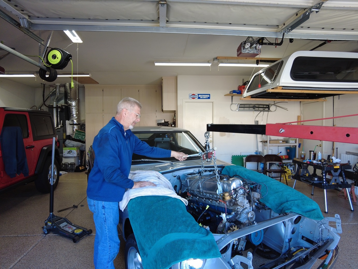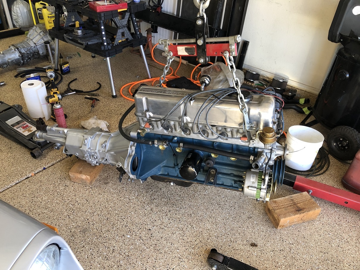Randy (Randalla) came over today to give me a hand pulling the motor out of the Z. Everything went pretty well getting it out. Need to order some new parts, do some cleaning and get things ready to go back in. Having some trouble getting the header and down pipe apart but will get it one way or another. :|