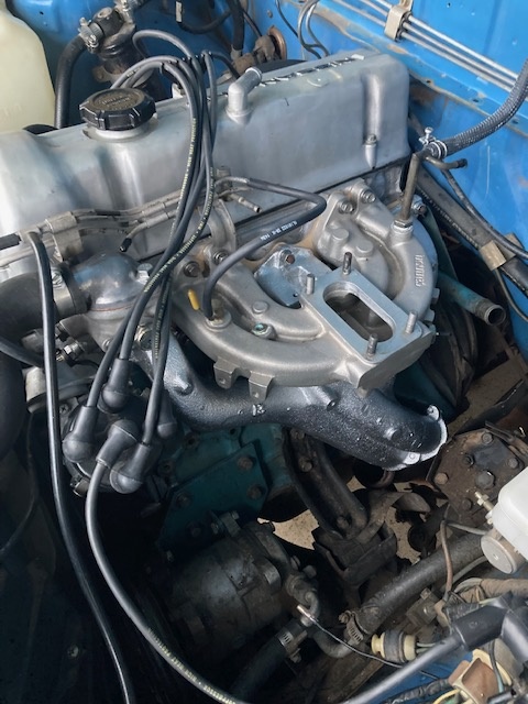Finally getting back to working on Clarence again. Decided to remove all the emission equipment since I'm replacing the stock carb with a Weber 32/36. This required quite a bit of work, including some fabrication to plug holes left from the removed parts and having a baffle cut out of the cast iron exhaust manifold. Also lots of cleaning and painting to help tidy things up in preparation for the new carb. Here's where I'm at as of today.