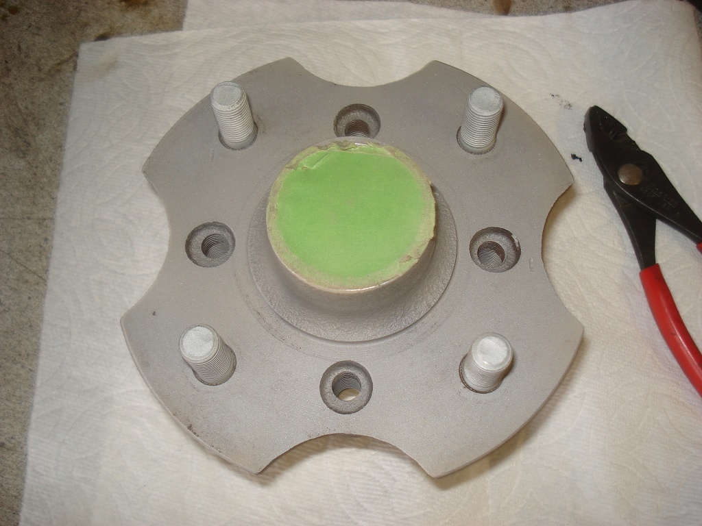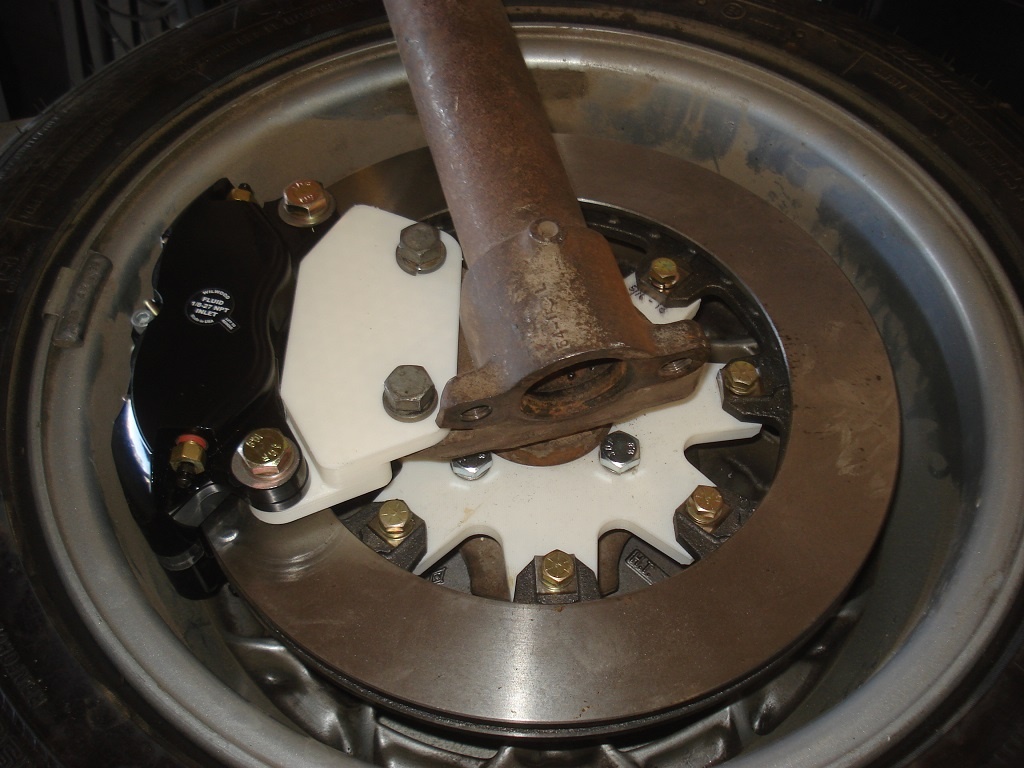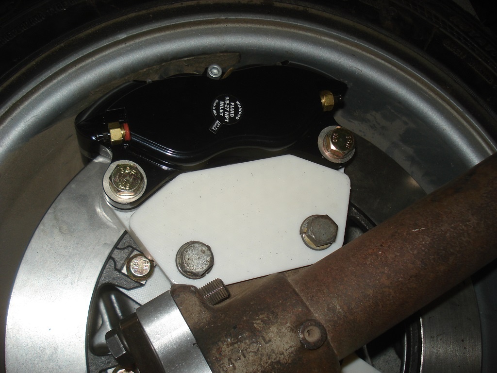 Did a little modification to my brake hats. Beefed up the spokes to 1/2" thick, and added 1/16" offset to center the disc in the calipers. Mounted the new parts and checked clearance on my snowflake wheels.