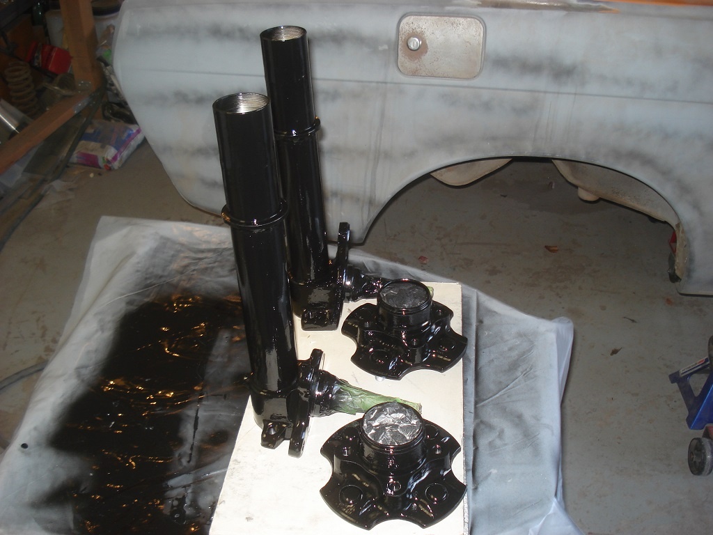 Finished painting my front struts and hubs. Nothing fancy. Two coats of Mastercoat followed by two coats of gloss black urethane. Pretty happy with the results, and they should be good for many more years now.