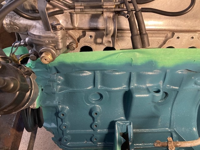 With the slightly cooler weather today, I spent 6 hours in the garage working on the truck, focusing on more cleaning, some painting, and dropping the front 3" by adjusting the torsion bars. I now have the driver's side of the engine block completely painted Datsun blue, as well as about 2/3 of the passenger side. Lots and lots of masking in the engine bay. Also sprayed the battery tray with POR 15 to neutralize surface rust and coat the one area on the truck with any rust through. Later in the day I installed all new manifold studs, and test fit the gasket and header.