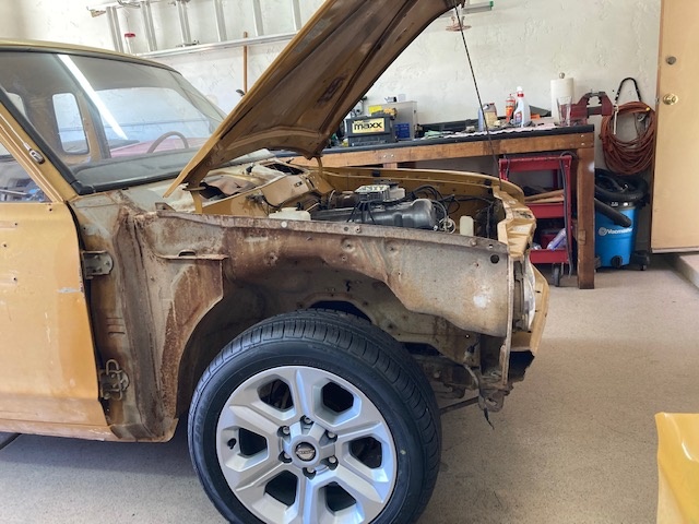 Installed the fan provided by Hitman (thanks again Greg) on the fan clutch, finished plumbing the fuel system today, and removed panels/pieces on the truck requiring the most straightening (passenger fender, bumper and front valence). Looks like I'll be getting lots of practice with a hammer and dolley. :lol:
