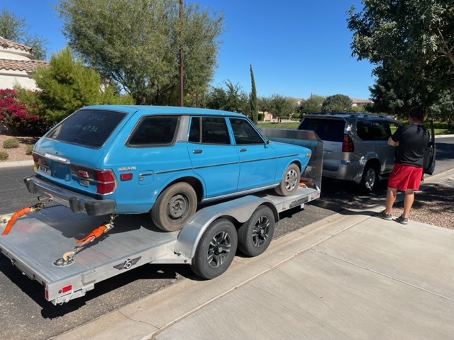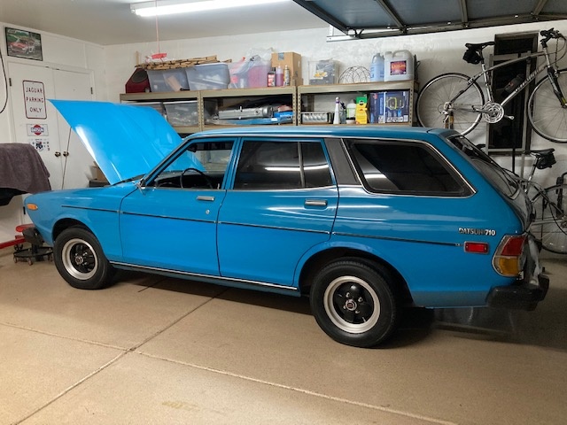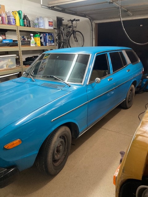 Robin assisted me dragging home another Datsun project today (I named him Clarence), albeit a pretty nice place to start a project. Car is a 1975 Datsun 710 wagon with a 4-speed and L20 B motor. Odometer shows 68K miles, which may be accurate based on the condition of the car. Have not heard it run, but the body and original paint was so nice, hearing it run and driving it seemed inconsequential (I may regret that, we'll see). Just started cleaning the interior out tonight and found $3.29 in change (so far) and an unused $100 Visa Gift Card. I'll be posting details as I work toward getting it on the road.