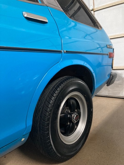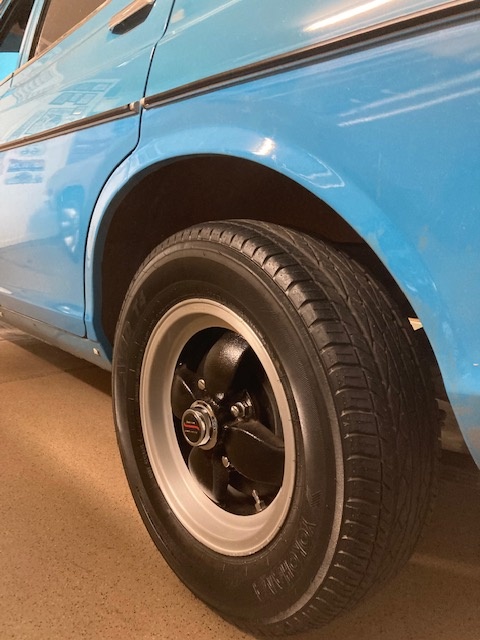 Forgot I had a nice set of 13" American Racing, Libre wheels and tires over in storage. I've had these for at least 10 years and thought I'd try them on the 710. Big improvement over the rotted tires and stock steelies that were on it. Size looks a little small, but I think I'm liking them. Also completely took apart the front grille, polished the chrome accent pieces, and cleaned, primed and painted the plastic black. It was originally a light gray, which was not very flattering. Waiting on 4 new old school headlights to finish assembly.
