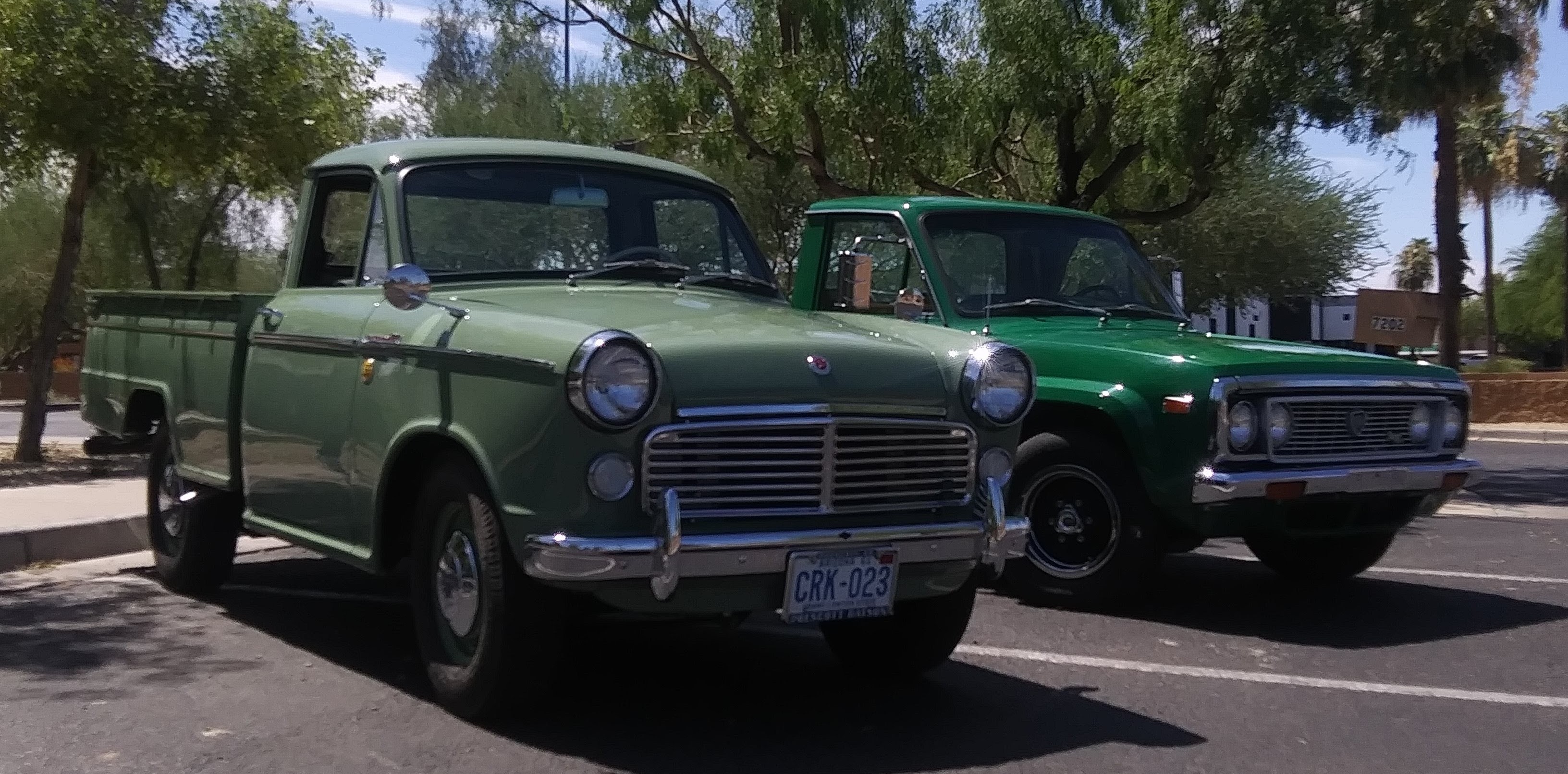 A 1962 Datsun 320 posing with a 1974 Mazda Rotary Pickup. Who said it's not easy being green?