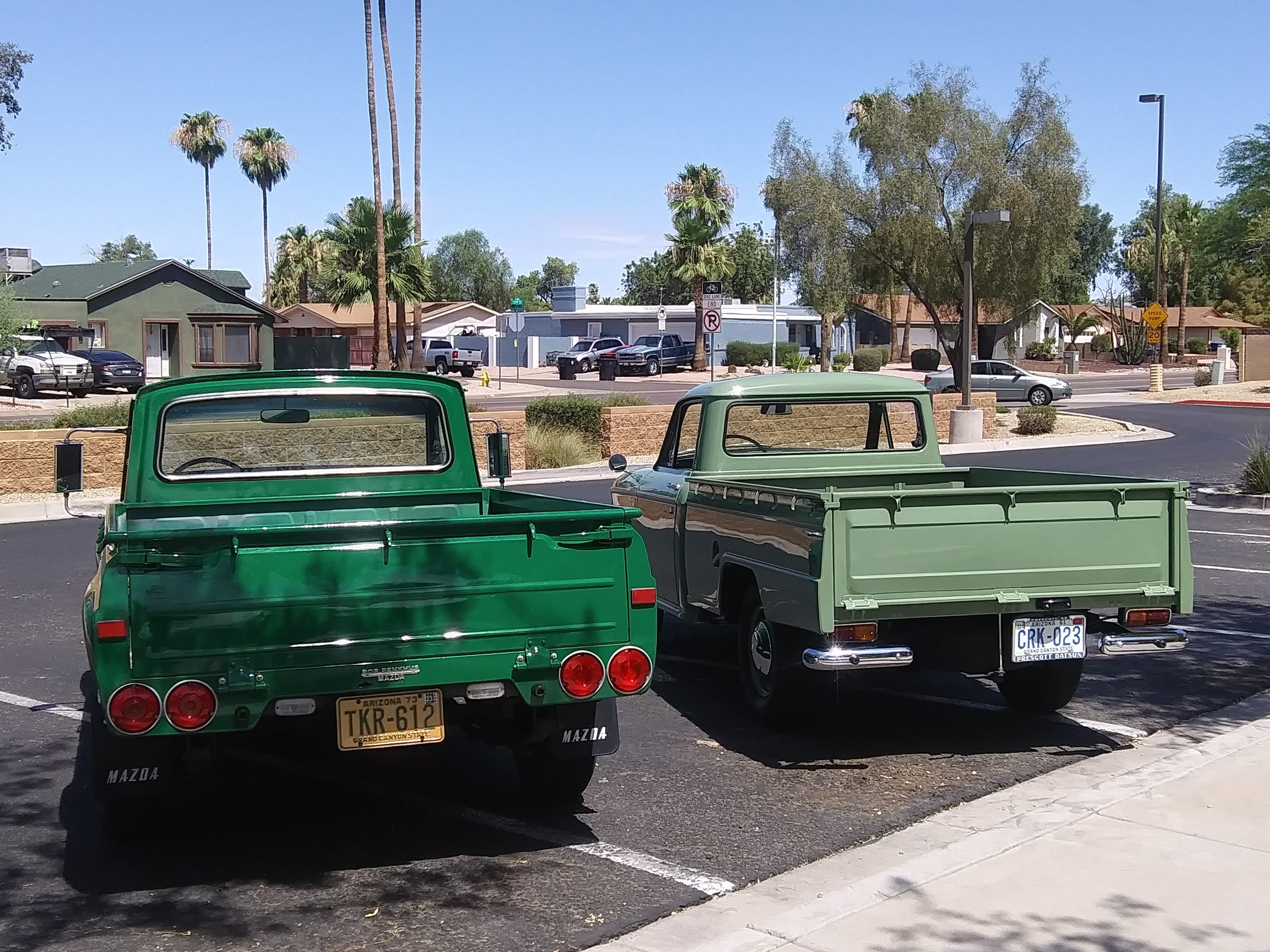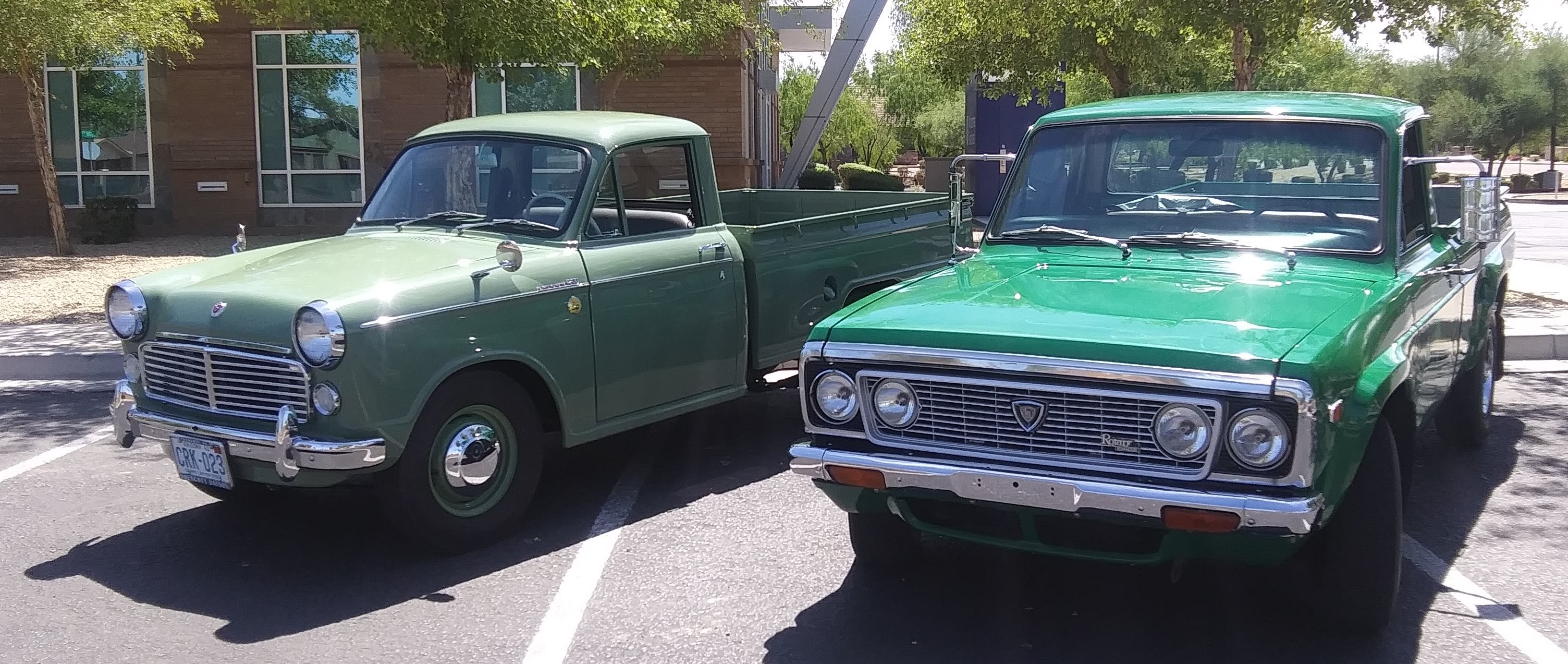 A 1962 Datsun 320 posing with a 1974 Mazda Rotary Pickup. Who said it's not easy being green?