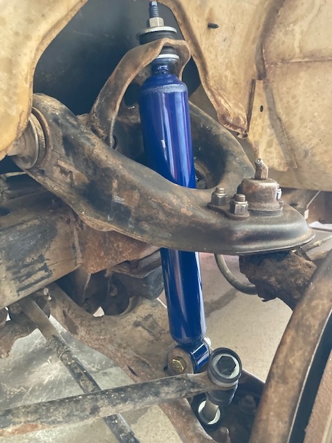 Today I finished bolting on the front shocks and new stabilizer bar end links. In the process, I evaluated the front disc brakes. I'm constantly amazed at the crazy stuff people do, jerry rigging things (potentially dangerously), rather than just replacing with the correct parts. Today I found one of the slider pins on the driver's side brake caliper substituted with what looks to be some type of construction fastener and piece of wire wrapped around it to hold it in place, Arghhhhh! Also noticed the inside pad on both driver and passenger sides was nearly gone, while the outside pad still had over 50% life left. Picked up new pads and hardware kit at O'Reilly this afternoon. Both rotors look like they'll need replacing as well. Since this 1977 truck did not come from the factory with front disc brakes, I was unsure if they were Datsun 620 or something else. After matching the pads up, it appears at some point the brakes were upgraded with 1978 or 79 620 parts.