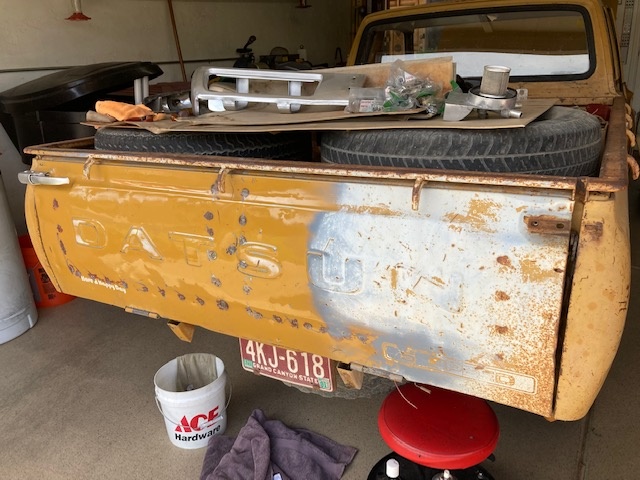 Last Saturday I got bit bad by my grinder, and today ended up at a hand surgeon to assess the damage. Fortunately I was lucky, no surgery and everything is intact, though still pretty painful. Slowed me down for a few days, but hard back at it today after hearing my doctor's assessment. I'm waiting on a pair of front brake discs, which I expect to arrive tomorrow, so I've been working on a few cosmetic issues. The tailgate is pretty rough and had multiple layers of paint on it over the butterscotch. I've been slowly working on removing the white and gray paint to get to the original paint, while still preserving the " 5-Speed" and "Have a Nice Day" vinyl appliques. Keep in mind this is a budget build. My intent is to make this a "work truck tribute", so the flaws just add to the truck's and the original owner's history. I'm really starting to embrace and have fun with this concept, and even tried reaching the original owners son this evening to get some history, hear his recollections, and share what I'm doing.