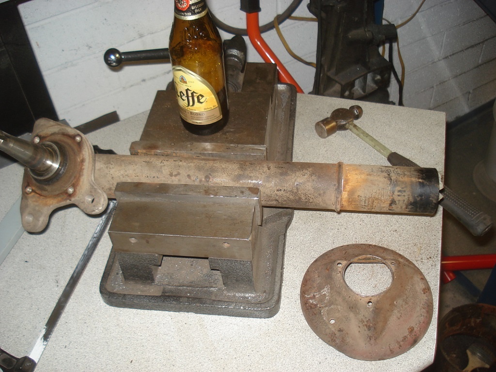 Blew off all the dust, removed the springs and the old shock insert. Cut off the upper spring perch by scoring it all the way around with a hack saw, then striking it with ball peen to tear the perch off where it was scored. Ready to cut and shorten the strut tubes for the new inserts now.