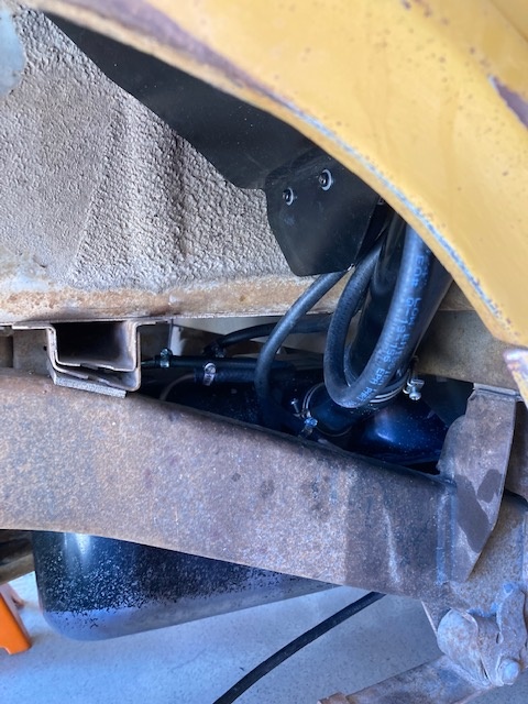 Decided to get one more thing off my workbench and re-installed the spare tire hoist this morning. I also finished re-installing the gas tank, vapor tank and all the related plumbing. Blew out all the lines to make sure they were free of obstructions. Hoping tomorrow to run the motor off the tank, and then on to finishing the rear brake job.