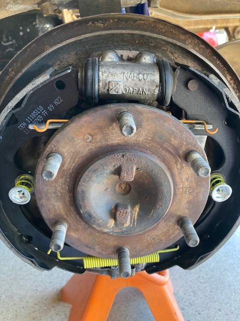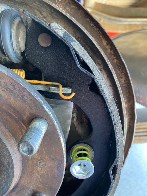 Having a real problem re-assembling my rear brake components. The new Rock Auto shoes don't seem to have the correct holes for mounting the top spring. I'm also not sure how the pull-off spring (not shown) is attached for the emergency brake lever. Any help/advice would be appreciated.