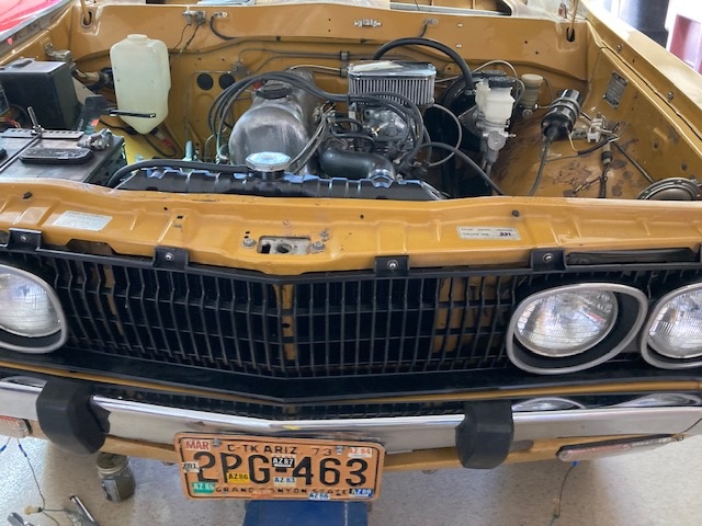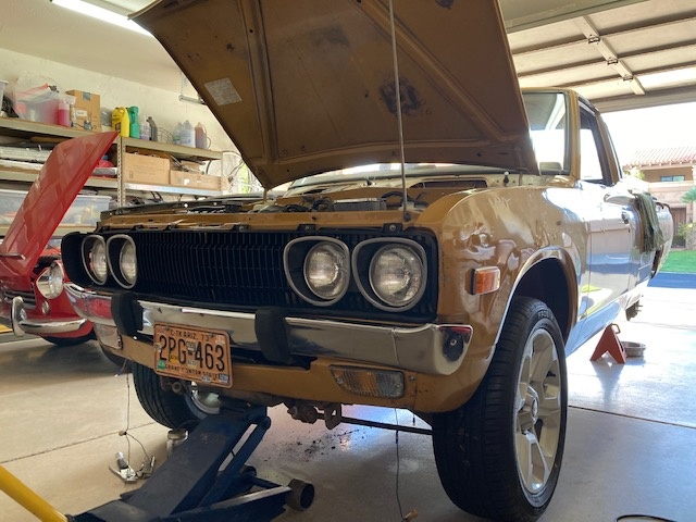 Test fitted the driver's fender, grille and bumper today. It's finally beginning to look like a truck again. With Ron's help we were able to bleed the clutch master, slave cylinder, and shift through all the gears with the engine running and the back end off the ground. Everything seems to be working so far. Even discovered in the process that the fuel sending unit and gauge are talking to each other. Tomorrow I'll be running out to Birdman's house to hopefully retrieve some necessary rear brake parts. The only thing at this point preventing a brief trip down the street is functioning brakes.