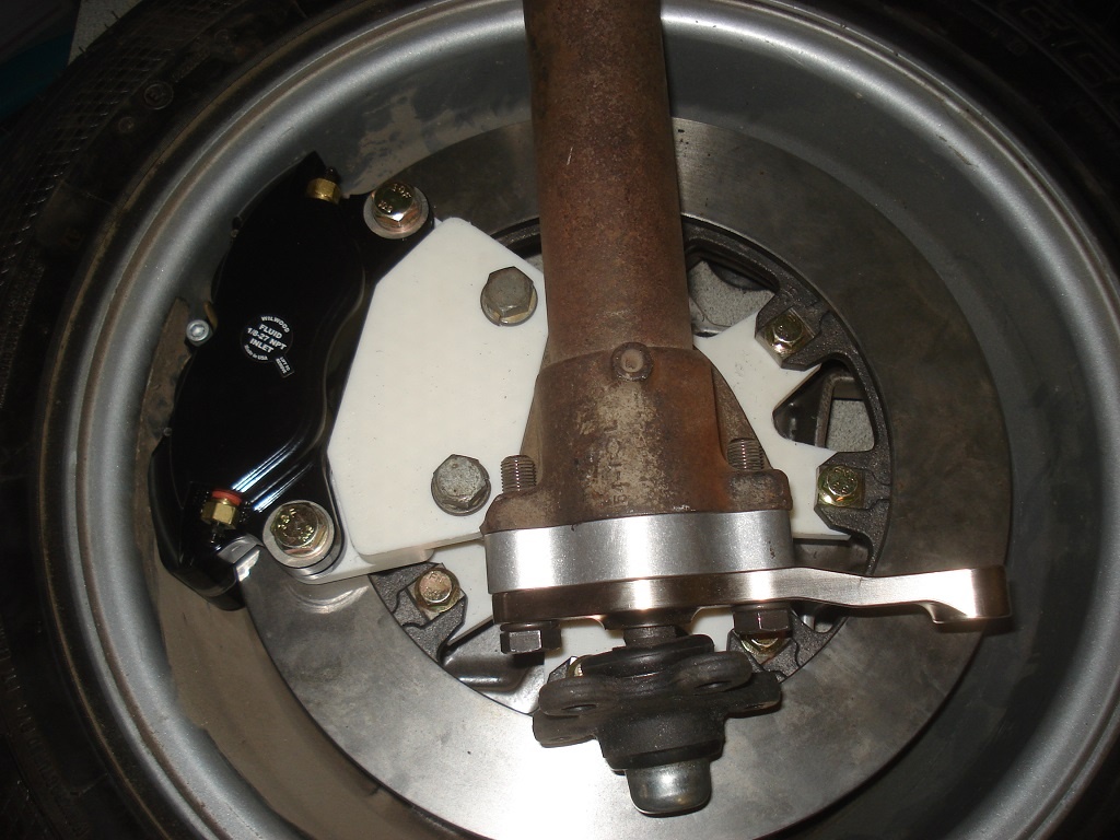Did a little modification to my brake hats. Beefed up the spokes to 1/2" thick, and added 1/16" offset to center the disc in the calipers. Mounted the new parts and checked clearance on my snowflake wheels.
