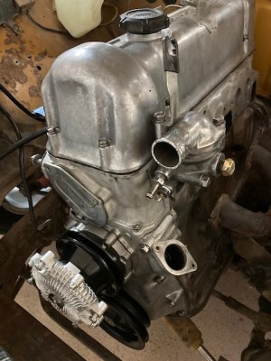 Refinished the grille today, masking off the bright headlight surrounds and rattle canning it with semi-gloss black. Just set the grille in place for a picture, then took it back out to provide access to my continuing engine work. Now onto the radiator. On a side note, the bolt I thought had dropped down where the timing chain is, was found today when I pulled the crank pulley. It had fallen and wedged itself between the pulley and the timing chain cover. Finding that bolt avoided a ton of extra work.