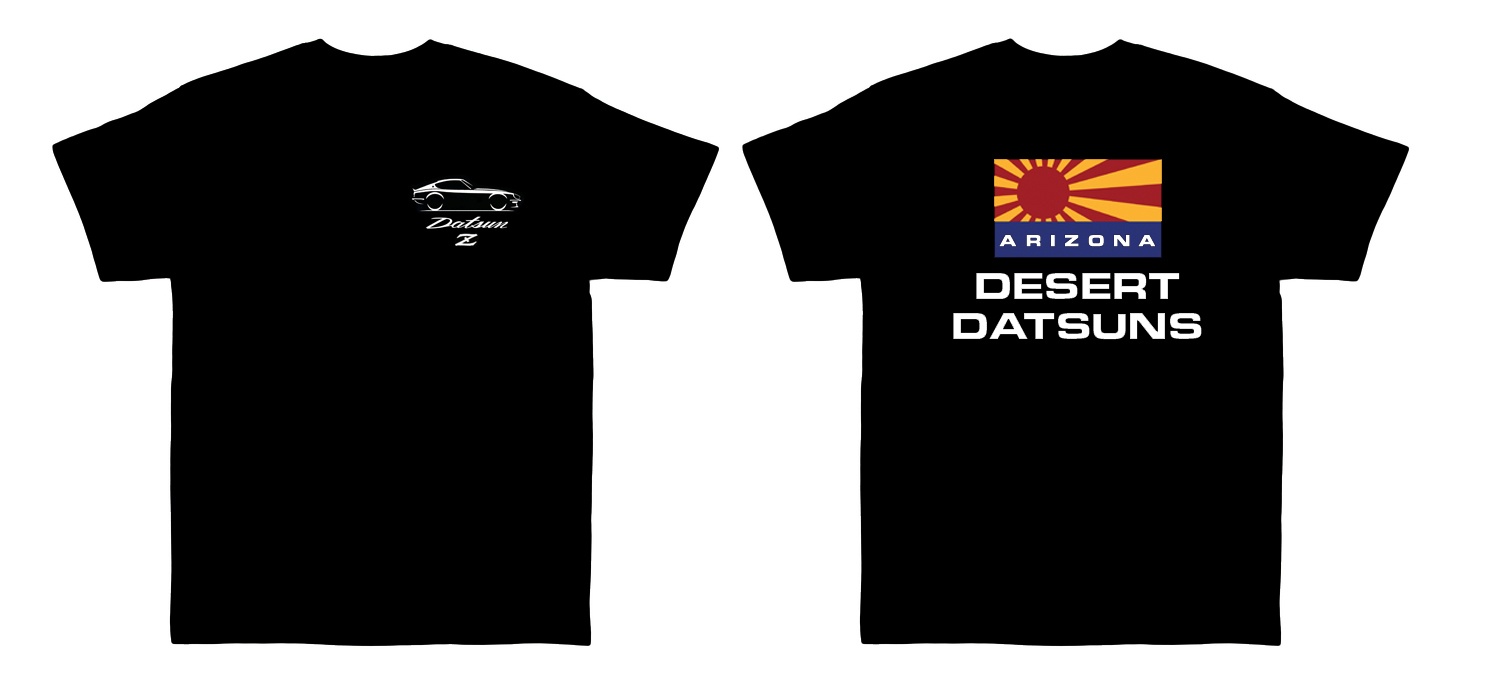 Wondering if there would be any interest in new Desert Datsuns T-shirts. One member asked me recently if we could do a shirt using the flag in our banner and the club name, "Arizona Desert Datsuns." The Desert Z Association is currently going through the same exercise, so I thought I'd ask. I would guess the shirts to be in the $15-20 range. I won't volunteer Lisa to do the design at this point, but if there is sufficient interest I'll try to twist her arm.