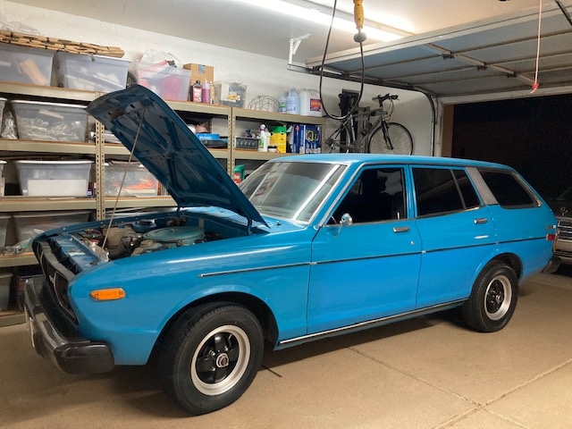 Robin assisted me dragging home another Datsun project today (I named him Clarence), albeit a pretty nice place to start a project. Car is a 1975 Datsun 710 wagon with a 4-speed and L20 B motor. Odometer shows 68K miles, which may be accurate based on the condition of the car. Have not heard it run, but the body and original paint was so nice, hearing it run and driving it seemed inconsequential (I may regret that, we'll see). Just started cleaning the interior out tonight and found $3.29 in change (so far) and an unused $100 Visa Gift Card. I'll be posting details as I work toward getting it on the road.